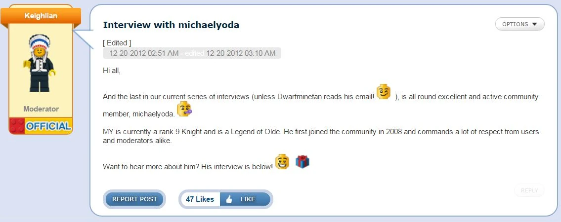 Well, as far as I can remember my first posts were trying to get clicks for MLN. Eventually I posted a little in other forums, then I joined a couple roleplays, and everything just kinda snowballed from there. 2. What do you think of the new LMBs? I think they're a vast improvement from the old ones. There's not only just the big changes like the layout, profiles and such, (loving the the increase of mod interaction, by the way) but there's also TONS of little things that a lot of people might not notice that make this place even more awesome! 3. What could we do to improve them for you personally? Way to ask me a hard question. 4. What do you think of the new rank structure and are you happy with your current rank? I LOVE IT! It is so much better than the previous one, in my opinion. I think it kinda makes you work maybe just a little more for your rank, just because we don't know how to get them. I am happy with my current rank, (partly because it's kinda flashy) but I enjoy it when I gain one. Gaining a rank is always pretty cool, but it's good to remember that it's just a rectangular beneath your name. 5. Do you miss being a “Legend”? Well, other than it being an image that went well with my avatar, I don't miss it too much. 6. What kind of things do you post? Posts like the ones I've been posting. If we met IRL I'd be much of the same. 7. What kind of posts are you likely to give “likes” to? One's that I enjoy reading. If they're well written, heartfelt, and just enjoyable overall to read. 8. Do you use the LEGO.com galleries? If so, which ones? Not often, I rarely visit them anymore. I used to post things in the LU Creation Lab, and I posted a couple of creations in the Star Wars gallery but that's about it. 9. If you could be any minifigure what would it be? I'm not sure...probably one that I don't have yet. 10. What is your favourite LEGO set? Probably the expensive ones I don't have. 11. What advice can you give to other users who admire your positive and friendly approach on the LMBs? Be active, for one. Other than that, just be (or continue being) friendly and helpful. Just be yourself. 12. What would you like a future poll to be? Eesh, I really should think of these things. Hmm, maybe a favorite LEGO theme poll? I was thinking Star Wars, City, Ninjago, Lord of the Rings, and maybe Creator. |