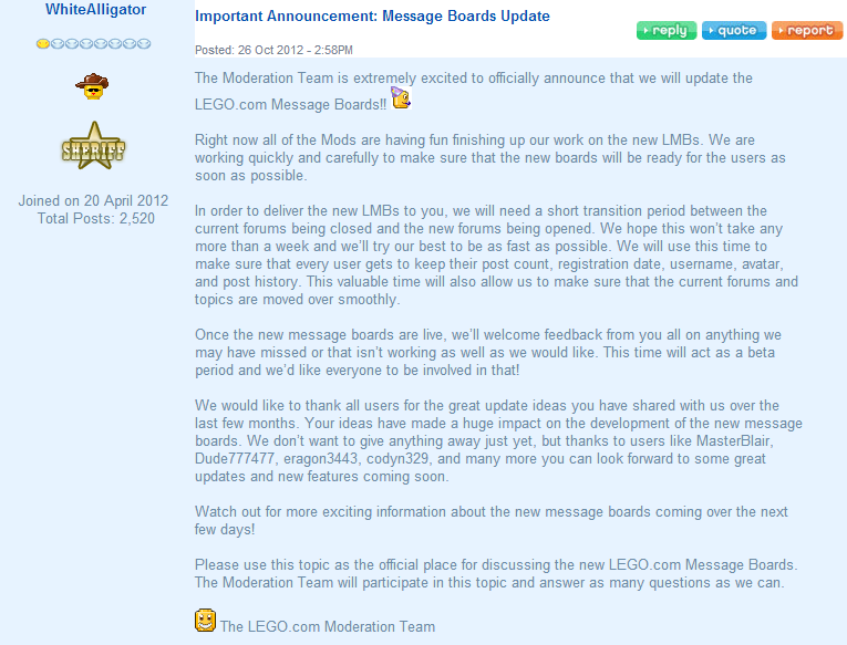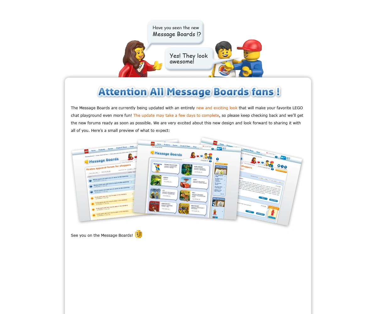 "The Moderation Team is extremely excited to officially announce that we will update the LEGO.com Message Boards!!